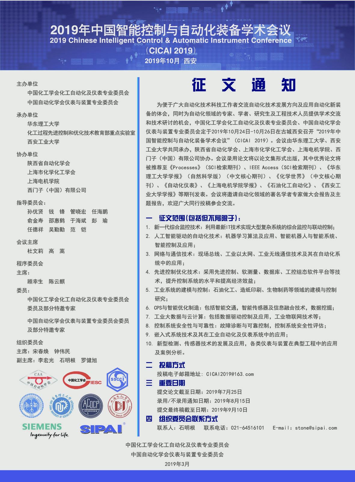 为便于广大自动化技术科技工作者交流自动化技术发展方向及应用自动化新装备的体会,同时为自动化领域的专家、学者、研究生及工程技术人员提供学术交流和技术研讨的机会,中国化工学会化工自动化及仪表专业委员会、中国自动化学会仪表与装置专业委员会定于2019年10月24日——10月26日在古城西安召开“2019年中国智能控制与自动化装备学术会议”(CICAI 2019)。会议由av在线 、西安工业大学共同承办,陕西省自动化学会、上海市化学化工学会、上海电机学院、西门子(中国)有限公司协办。会议录用论文将以论文集形式出版,其中优秀论文将被推荐至《Frontier of Chemical Science and Engineering》(SCI检索期刊)、《Processes》(SCI检索期刊)、IEEE Access(SCI检索期刊)、《av在线 学报》(自然科学版)(中文核心期刊)、《化学世界》(中文核心期刊)、《自动化仪表》、《上海电机学院学报》、《石油化工自动化》、《西安工业大学学报》等期刊发表。会议将邀请自动化领域的著名学者专家做大会报告及主题报告,欢迎广大同行投稿参会交流。