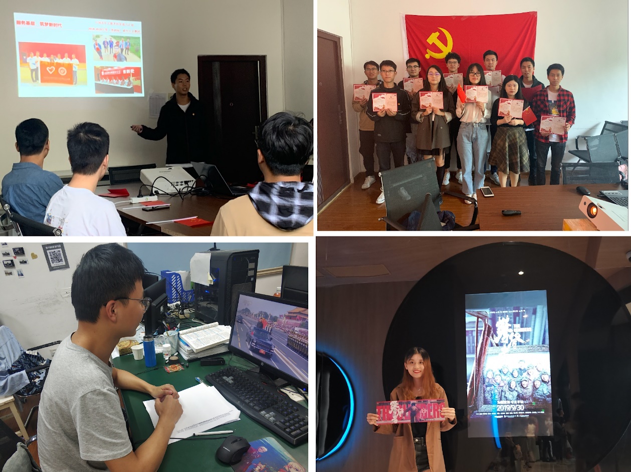 国庆前后,该支部还开展了 “政治生日主题会”、“专题党课”、“我和我的祖国”等系列活动。在“我和我的祖国”主题活动中,支部成员利用国庆假期分别开展了“观看国庆阅兵式”、“观看红色影像”、“志愿服务”等多种形式活动,以饱满的热情为祖国庆生。在“专题党课”活动中,支部党员黄一鸣,分享了他对“不忘初心、牢记使命”主题的理解,并结合理论学习视频材料,鼓励支部成员在今后学习生活中,发挥党员先锋模范带头作用。在“政治生日主题会”活动中,党支部为陈志刚等10位党员集体过政治生日,通过贺卡赠送、交流分享等方式为“过政治生日”的同学送上了祝福。在过自己政治生日的同时,支部书记袁晴龙也分享了他在寻甸支教一年经历,一年支教生活让他个人在各方面都很到了很多锻炼,他表示他将继续关注祖国边远地区的发展,也希望能和支部成员一起参与到志愿奉献中去。之后,支部本季度过政治生日的同学也纷纷发表自己的观点。