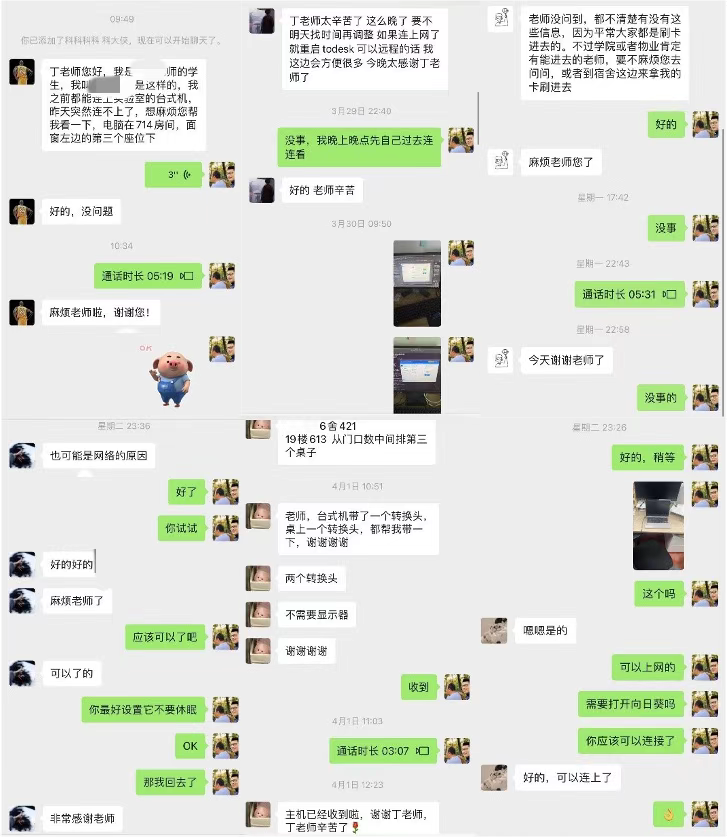 当前正值毕业季,部分学生课题需要随时调参和进行实验环境的设置,以保证实验能连续进行。正是因为丁炜超等老师的不辞辛劳、默默付出,确保了学生实验项目、论文的正常开展。一个月来,他先后帮助av在线 100多名同学解决学习和生活困难:为学生运送电脑、显示器、书籍、硬盘等学习资料,帮学生服务器、电脑中安装远程软件,调试设备及网络,使学生可以在宿舍远程操作实验设备。