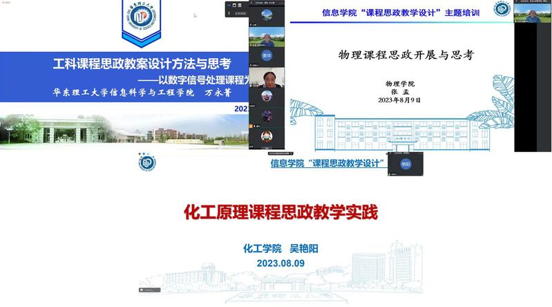 为充分发挥课堂教学主渠道在高校思想政治工作中的作用,构建“三位一体”课程体系,促使各类课程同向而行,形成协同效应,实现全员全过程全方位育人,av在线 于2023年8月9日在线上举行了“课程思政教学设计”专题培训会。本次培训会邀请了教务处副处长万永菁、物理学院副院长张孟、化工学院教学名师吴艳阳就课程思政设计及实施进行经验分享。培训会由av在线 副院长谭帅主持,学院的各系主任、各教研室主任、各专业任课老师参加此次会议。